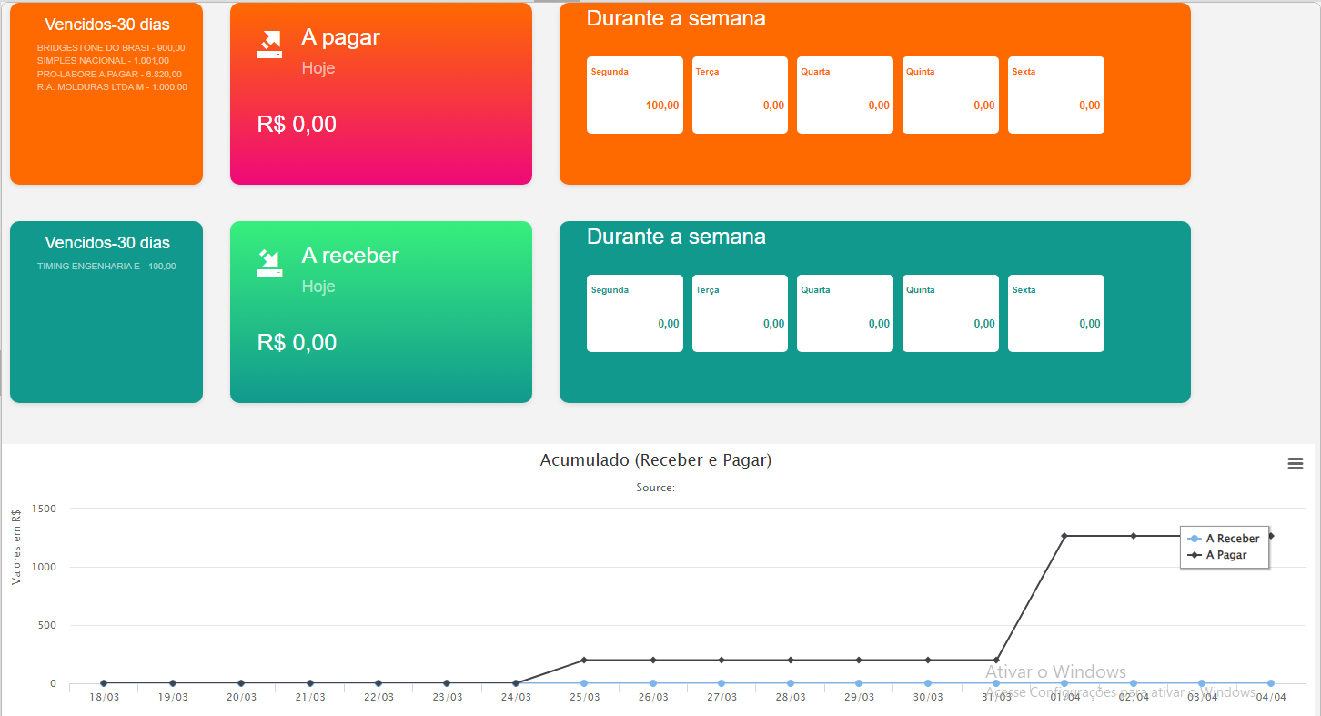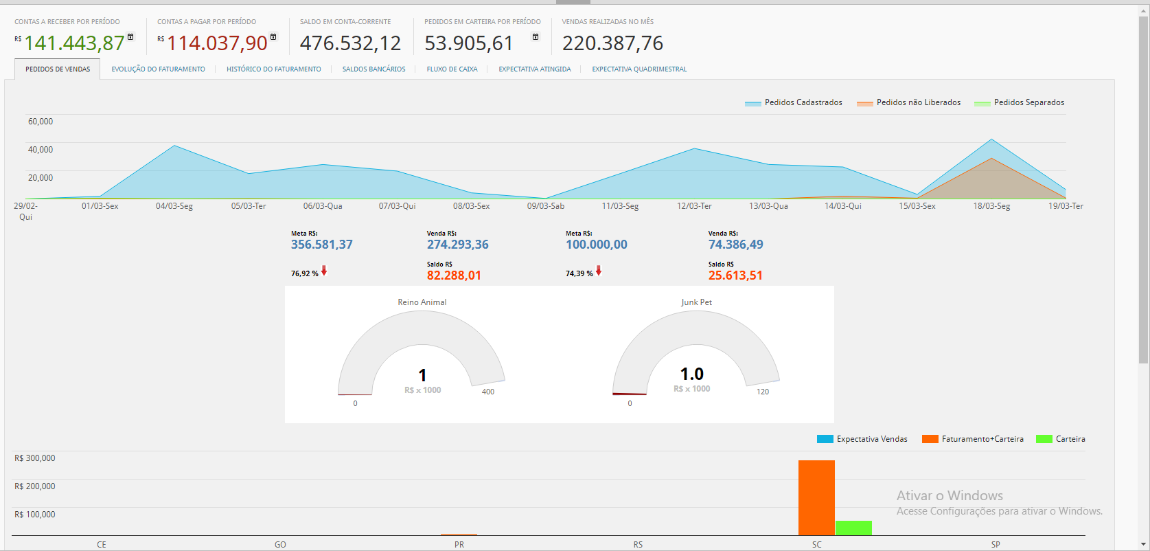 Dashboard das vendas, metas, receitas e fluxo de caixa;